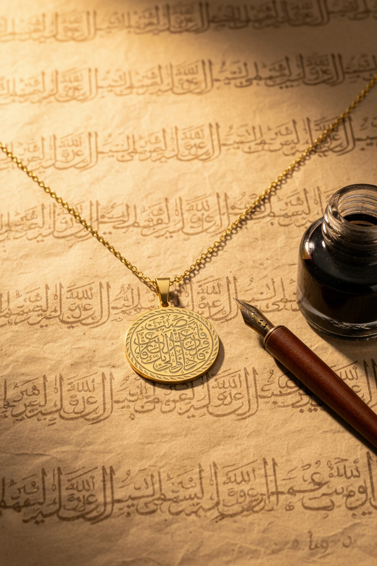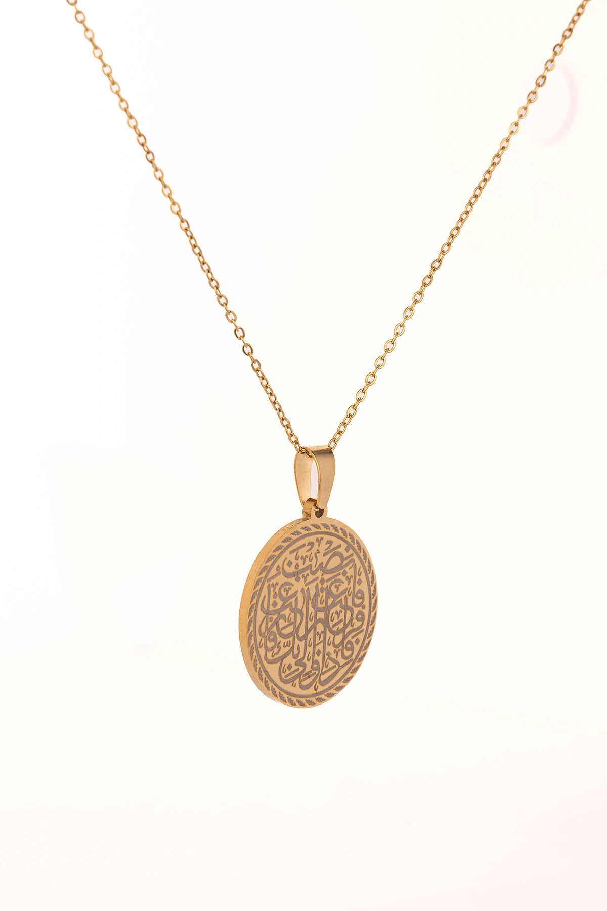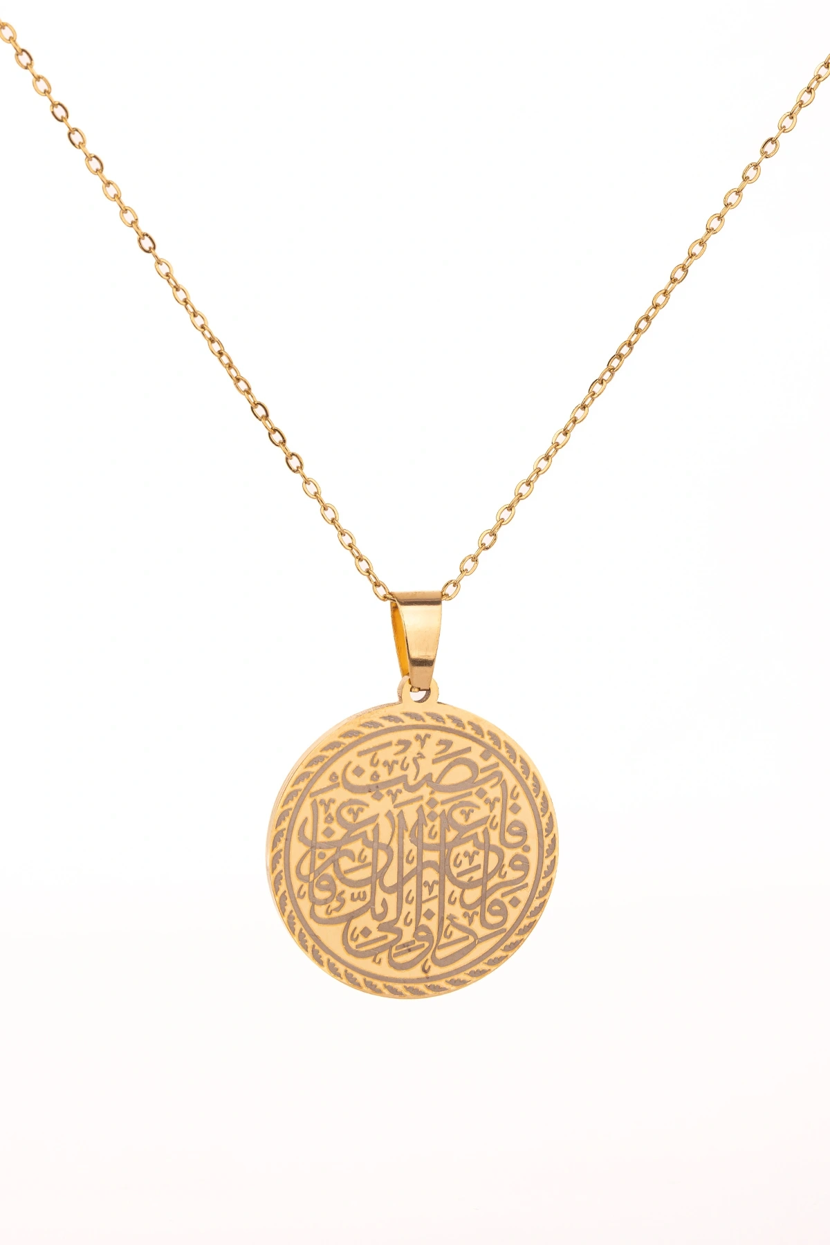 Altın renk İnşirah Suresi yazılı çelik kolye, zarafeti ve maneviyatı bir arada sunar.