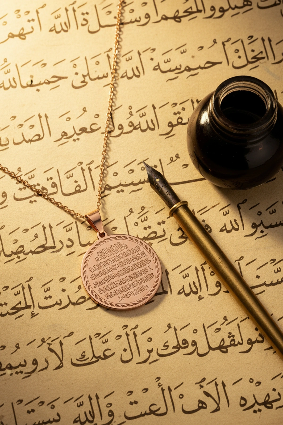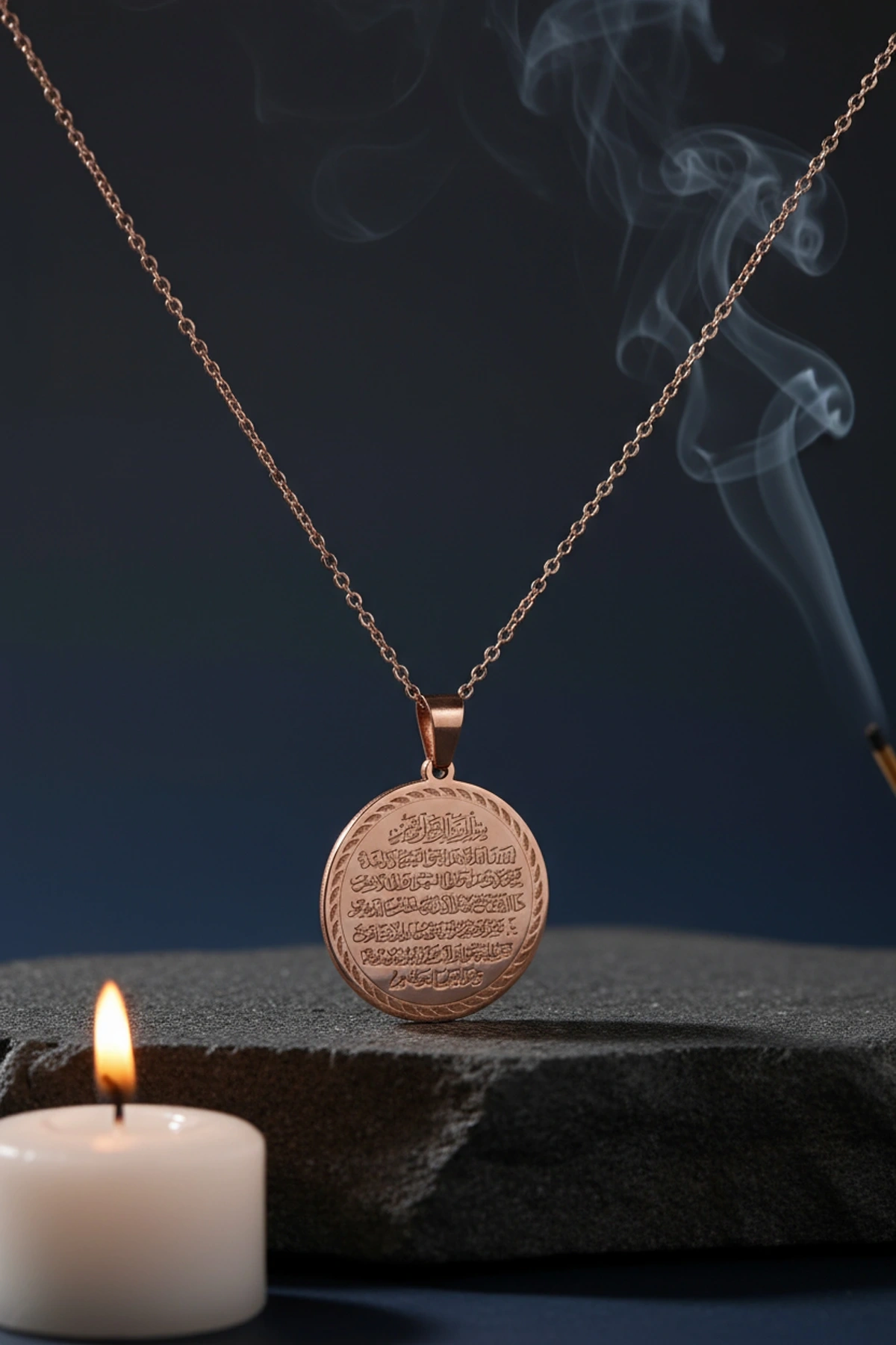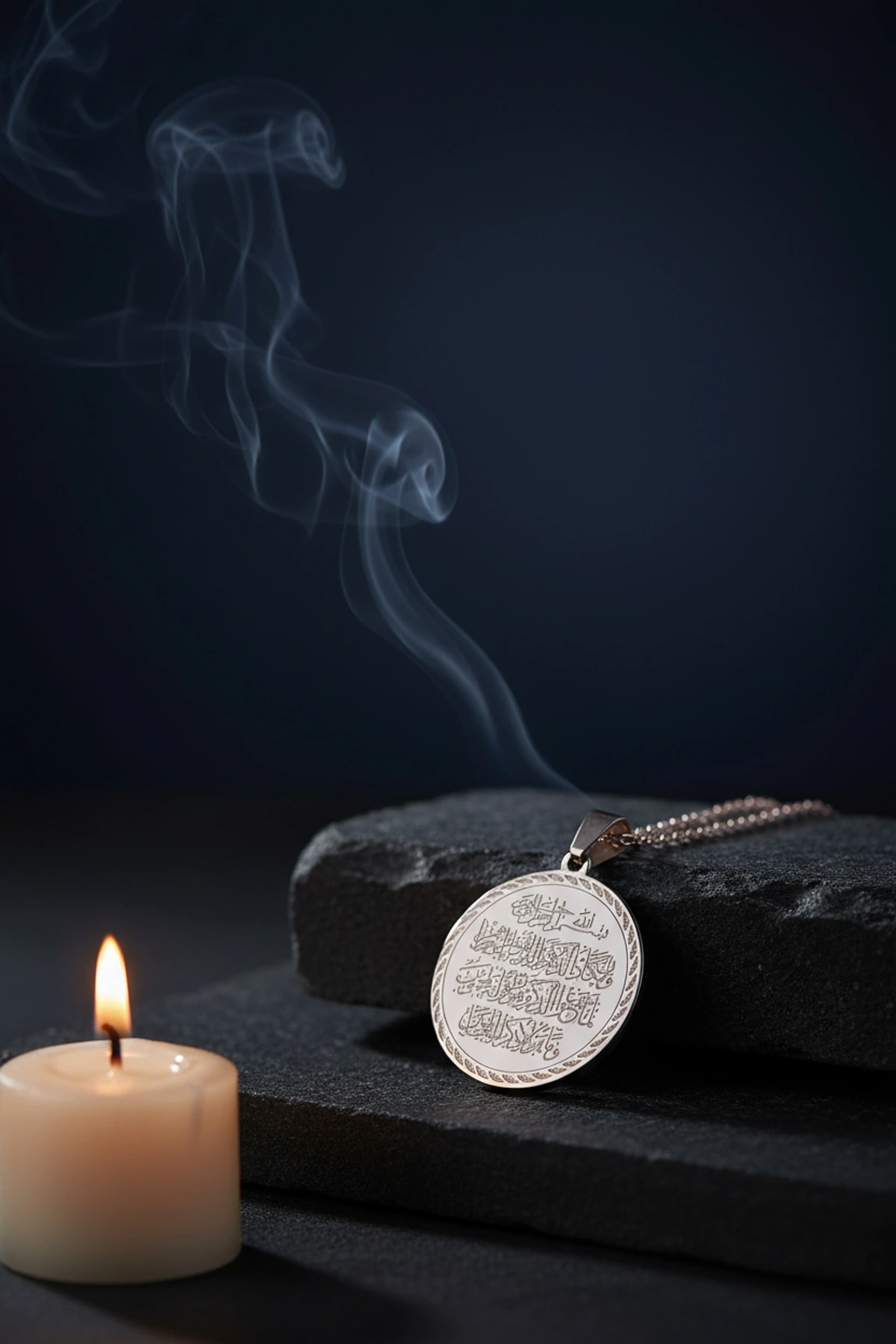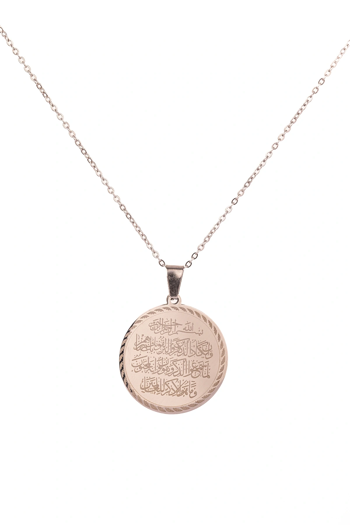 Gümüş renk Ayetel Kürsi ve Nazar Duası yazılı çelik kolye; koruyucu anlamı ve şık tasarımıyla günlük kullanıma uygun özel bir aksesuardır.