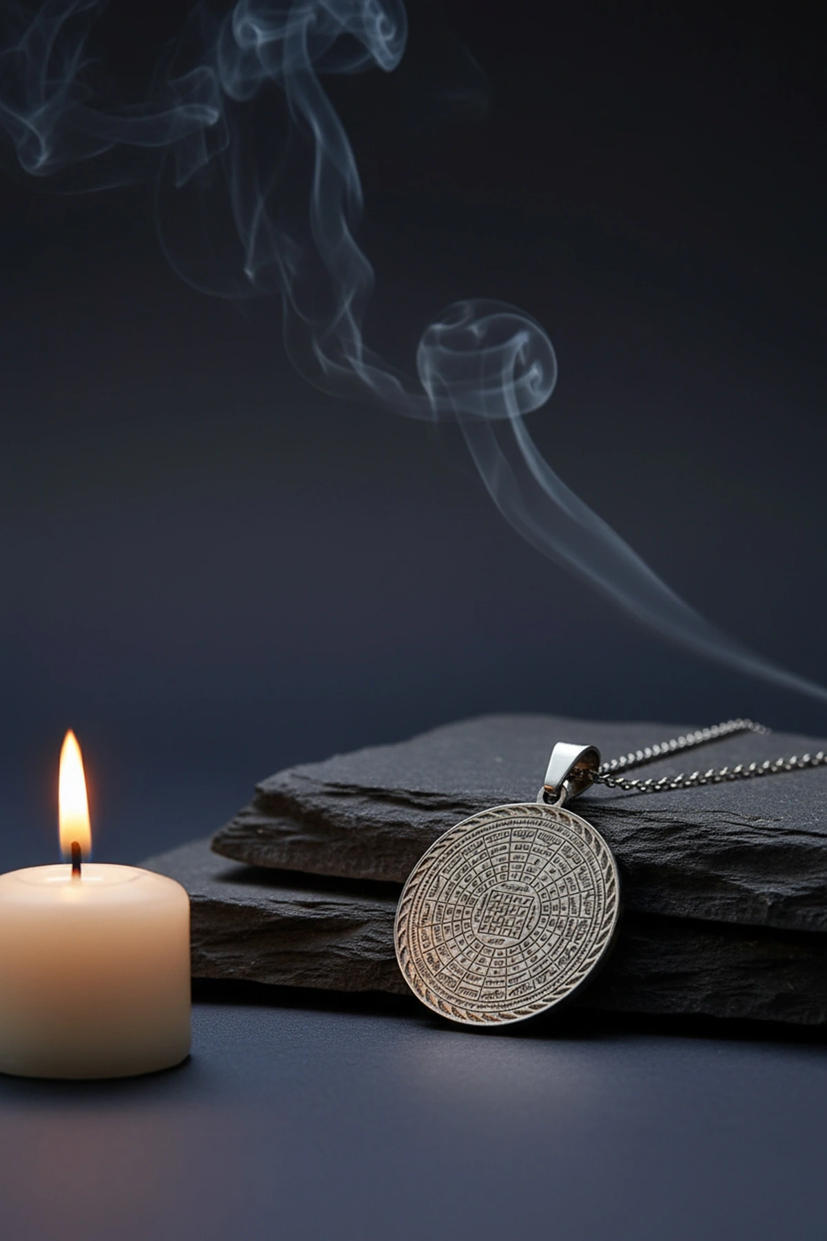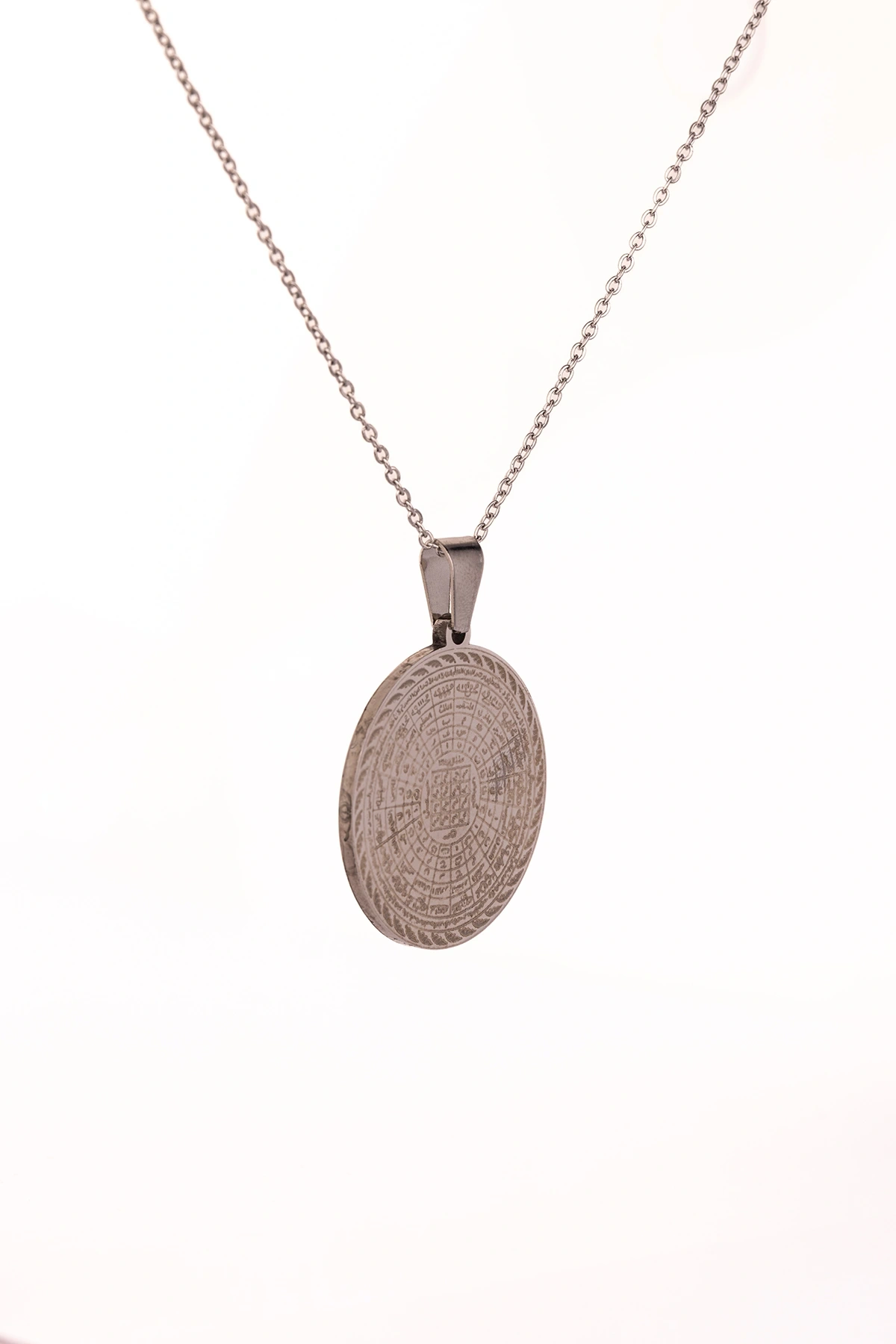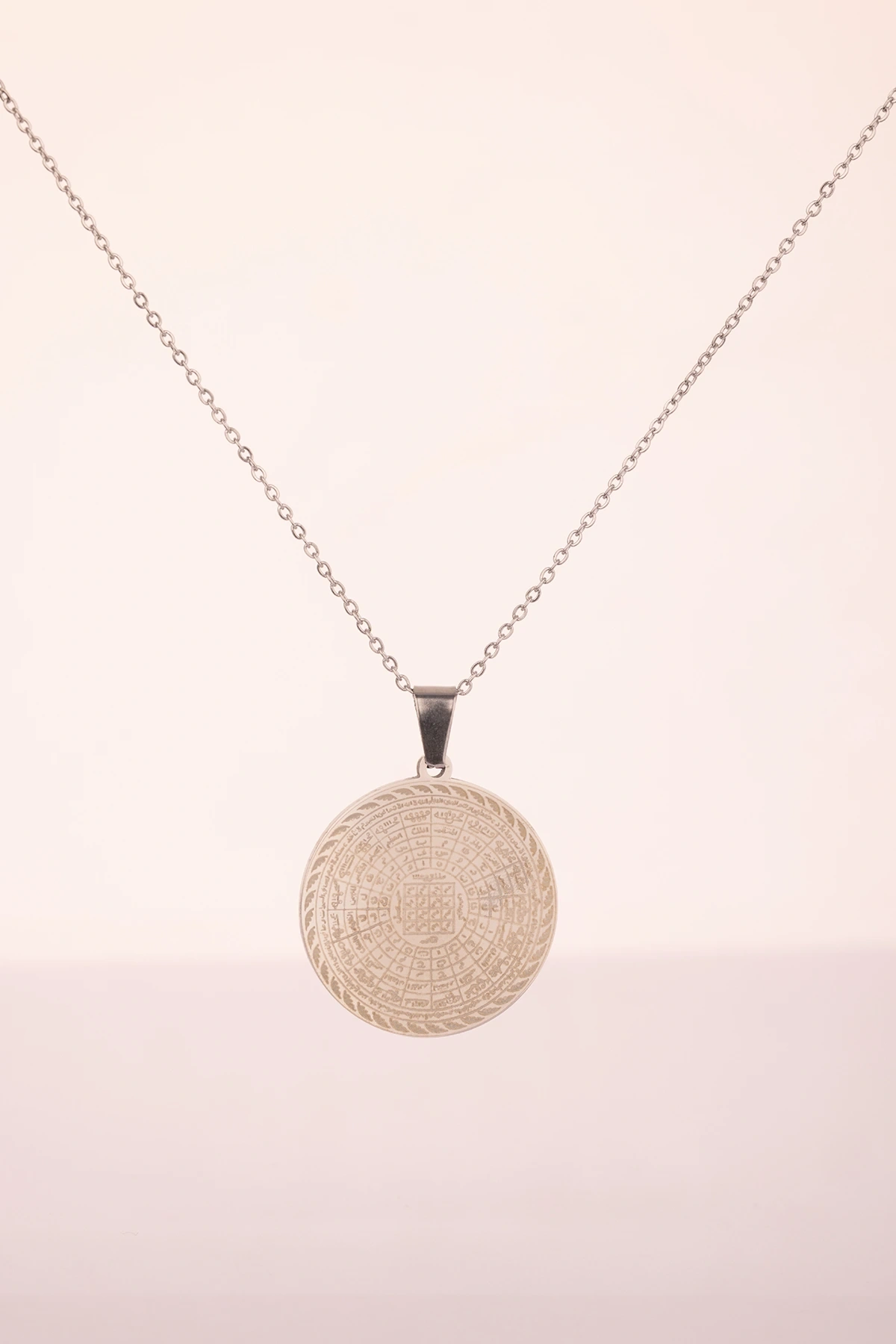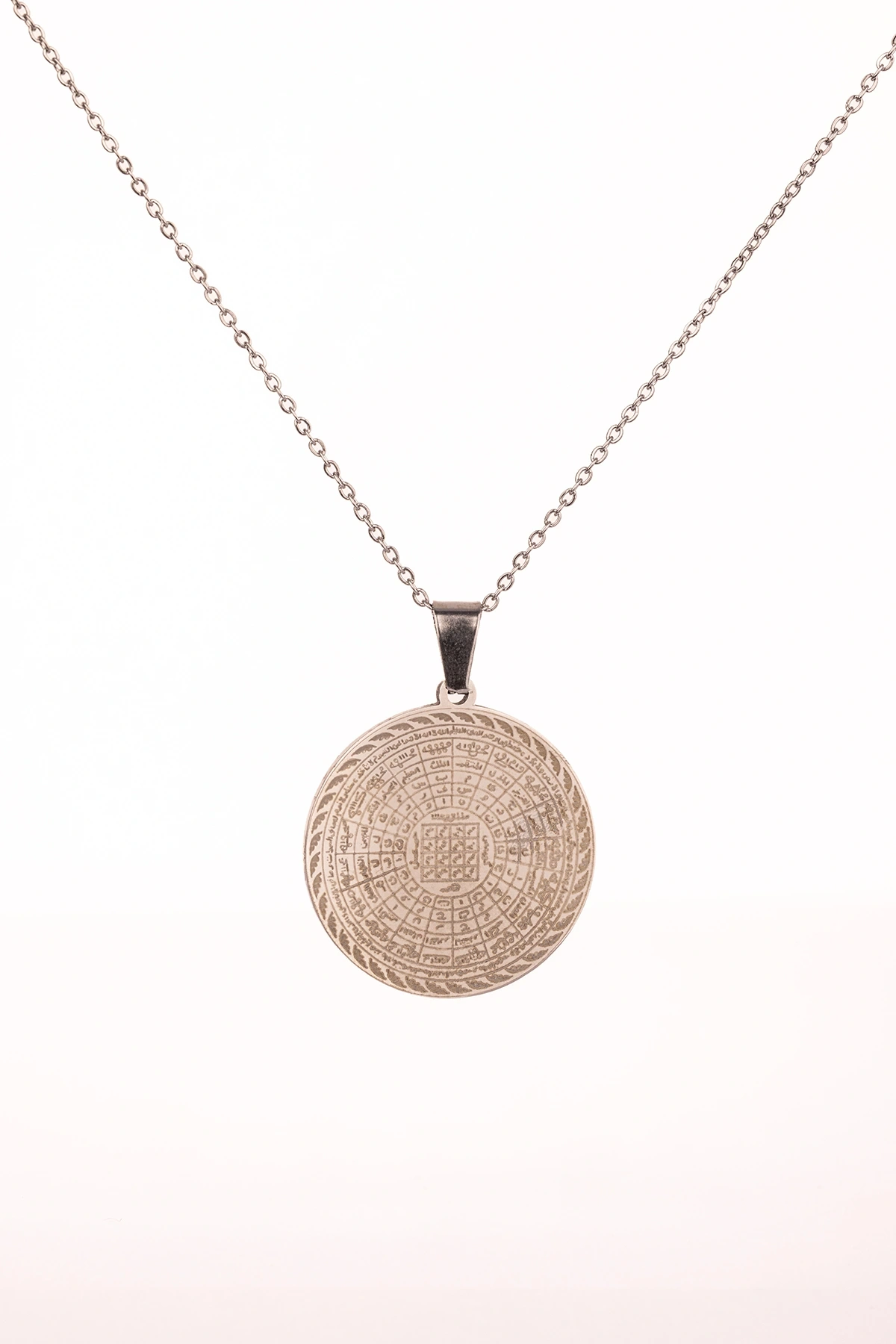 Cennetül Esma yazılı gümüş renk çelik kolye, manevi koruma, bereket ve şifa enerjisini bir araya getiren özel bir aksesuardır. 30 mm çapındaki yuvarlak tasarımı ve 60 cm uzunluğundaki kararmaz, paslanmaz çelik zinciriyle hem kadınlar hem erkekler için unisex kullanım sunar.