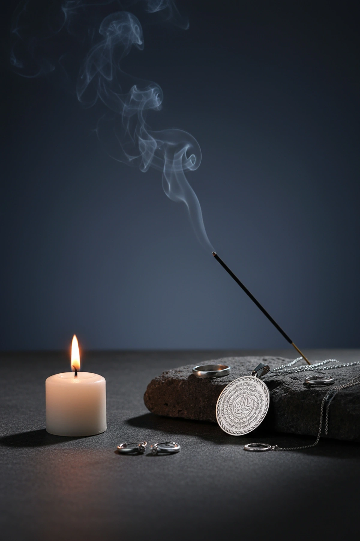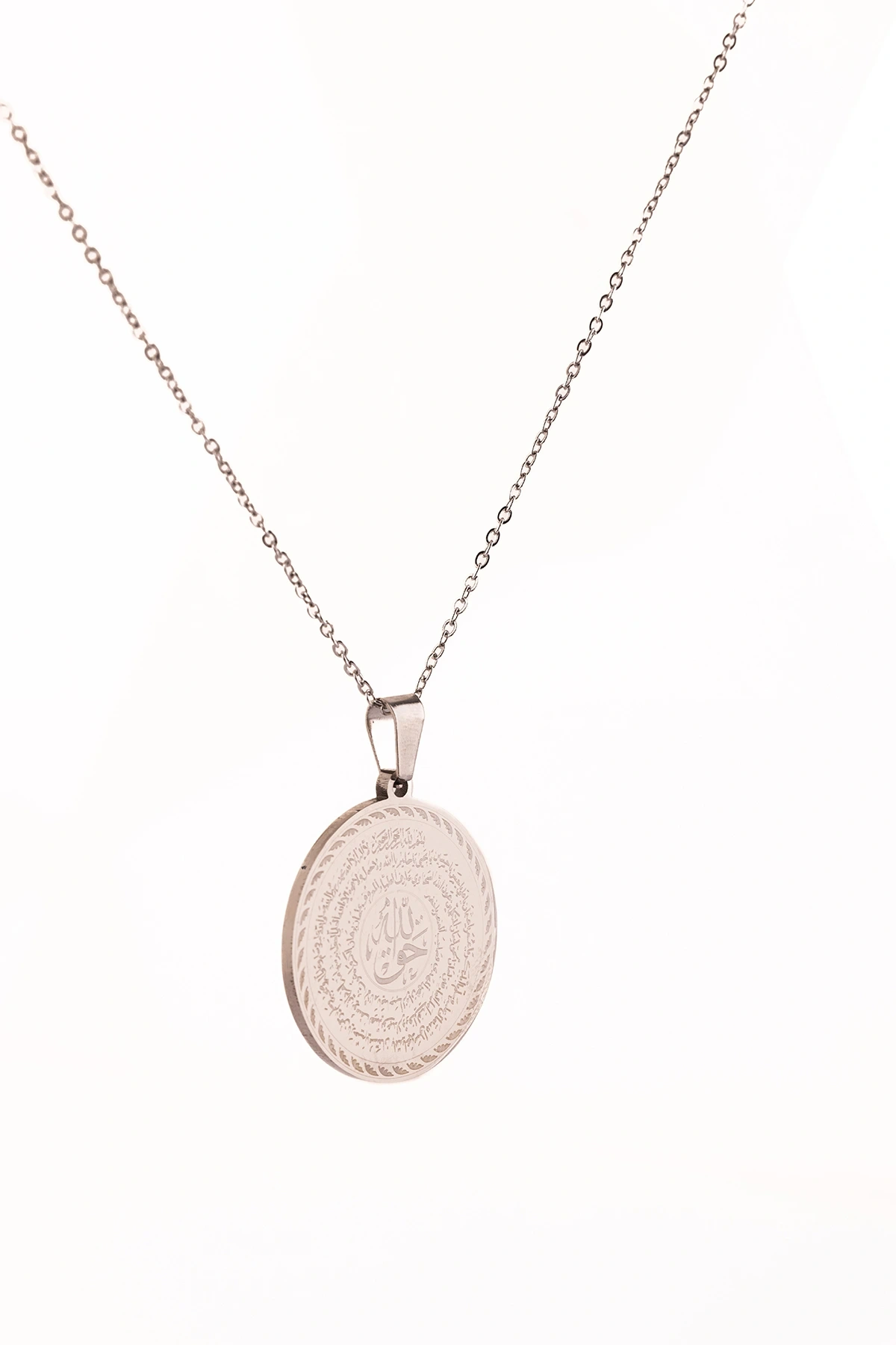 Gümüş renk Nal-ı Şerif ve Hakkani Mührü yazılı çelik kolye; koruyucu anlamı ve sade şıklığıyla günlük kullanıma özel tasarlanmıştır.