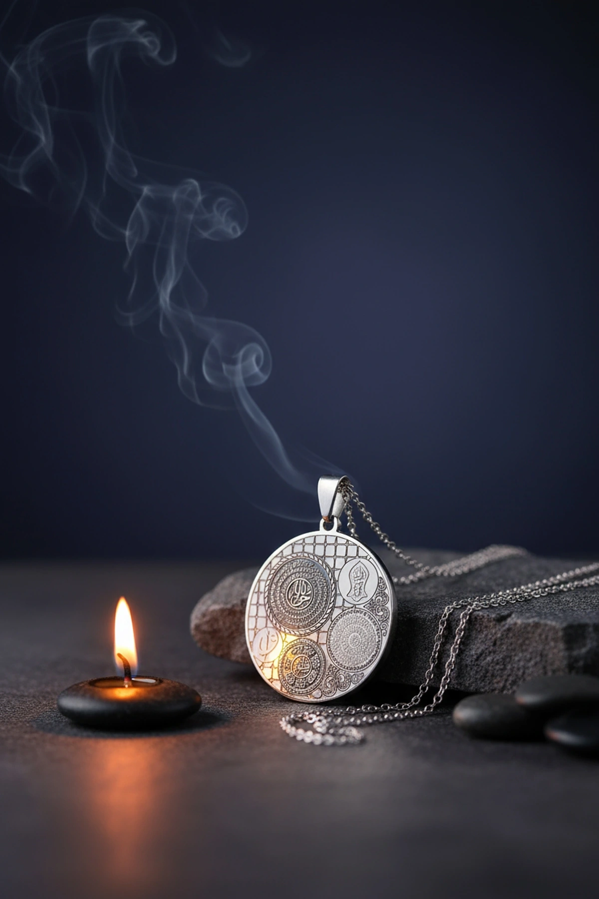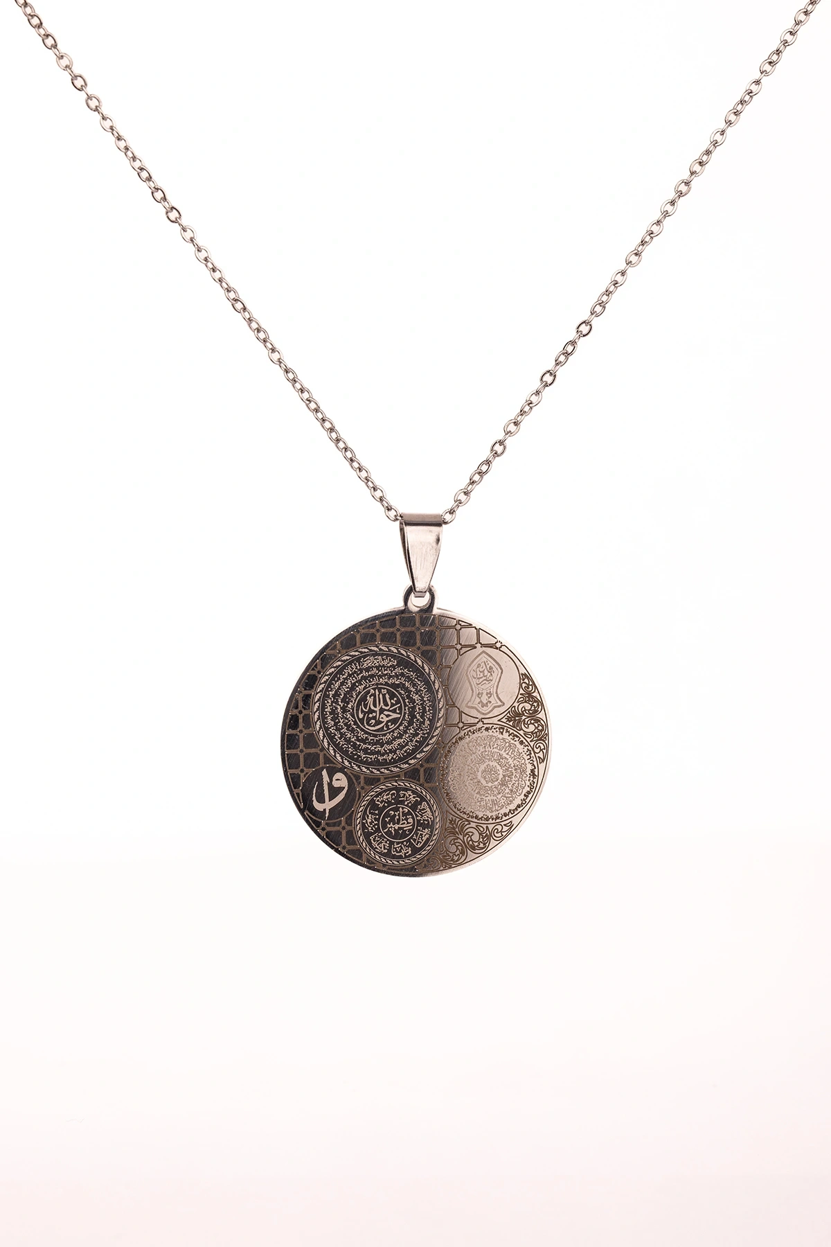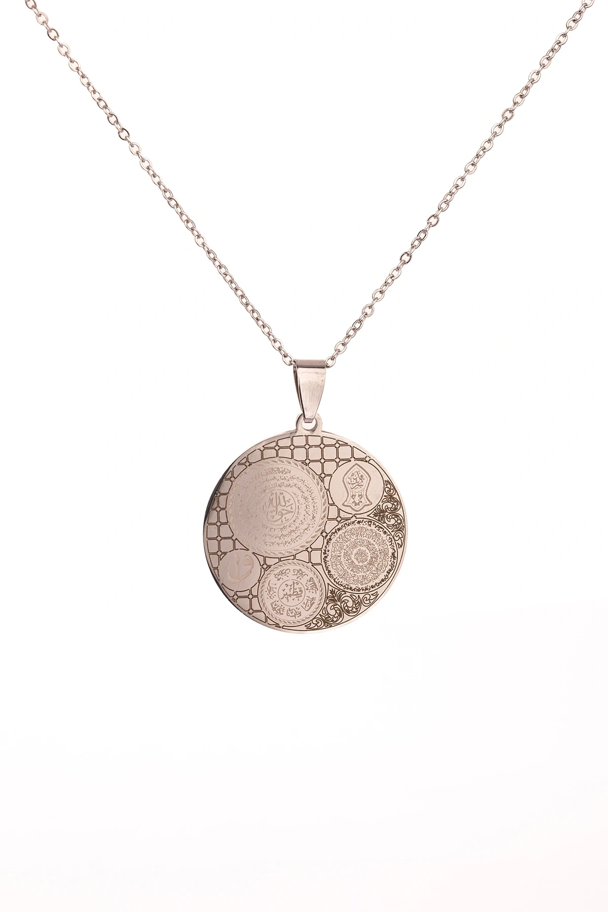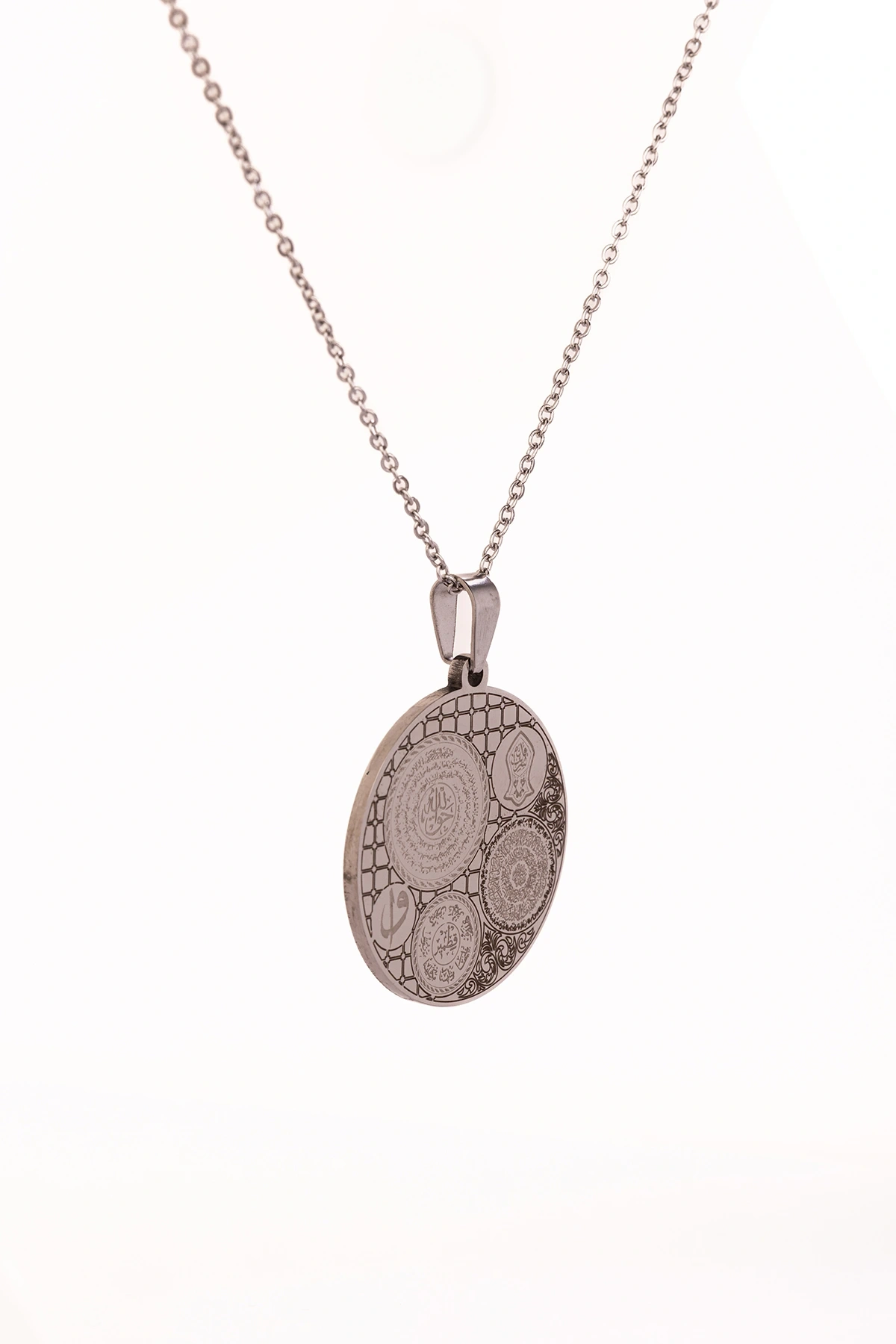 Gümüş renk titanyum kaplama çelik kolye, hem şık görünüm hem de manevi anlam taşıyan özel bir tasarımdır.