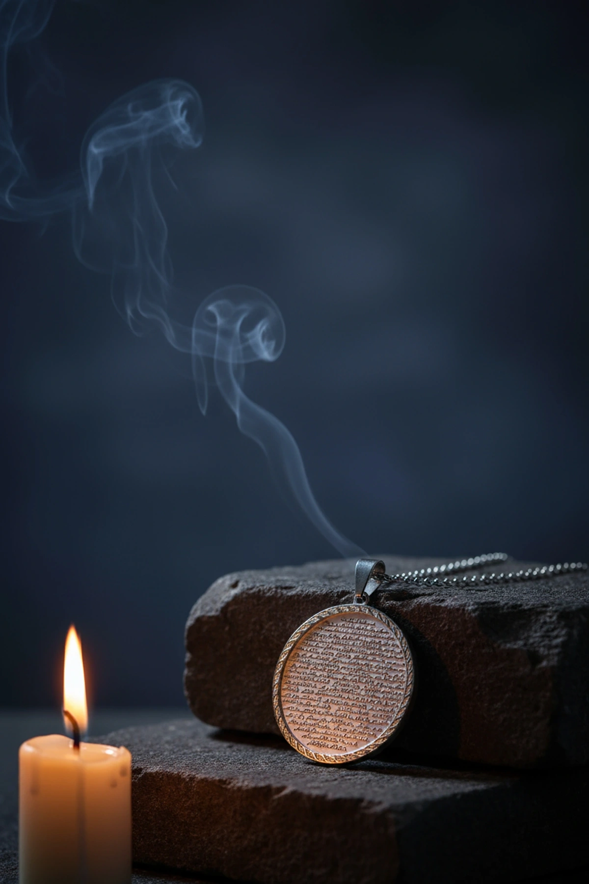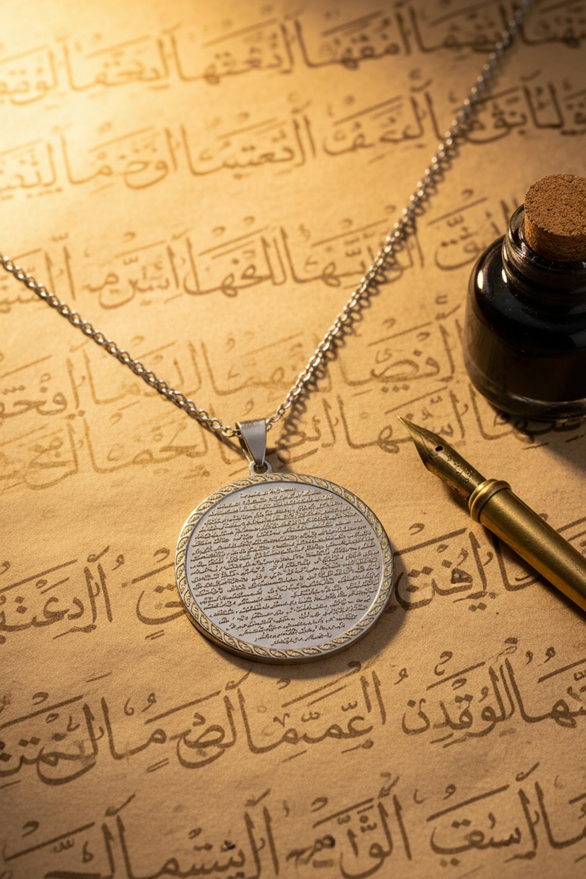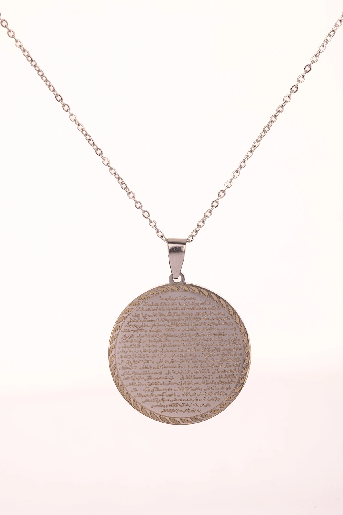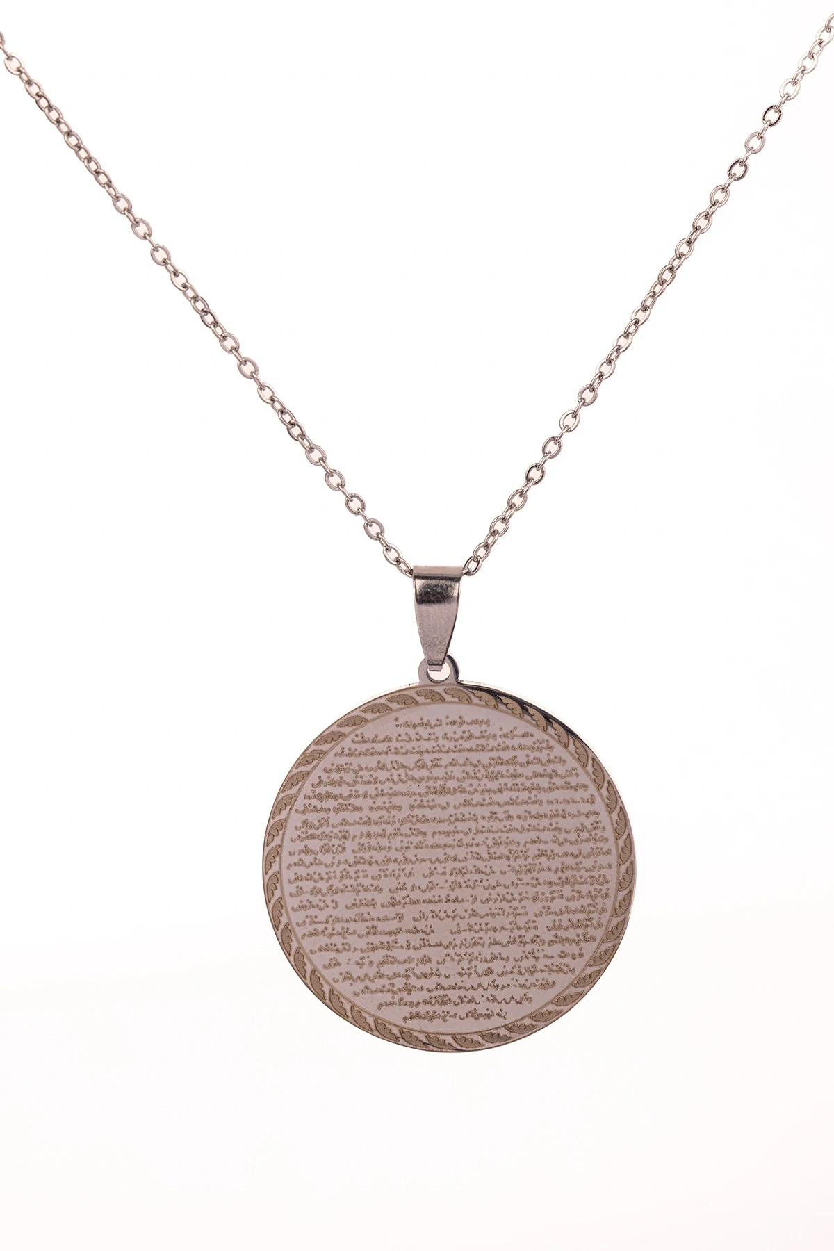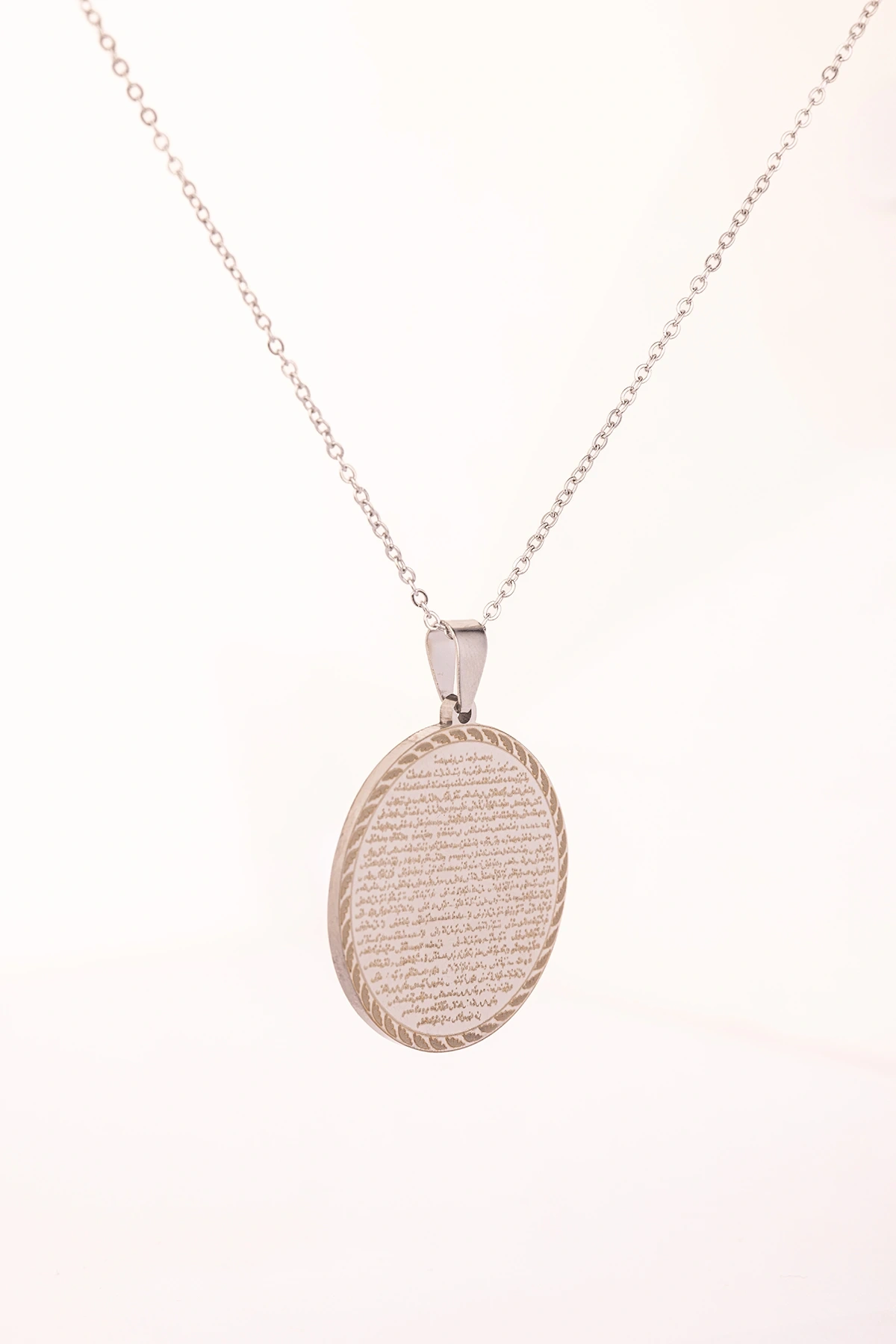 Vakıa Suresi yazılı gümüş renk çelik kolye, manevi anlamı ve şık tasarımı ile bir arada sunulmuştur.