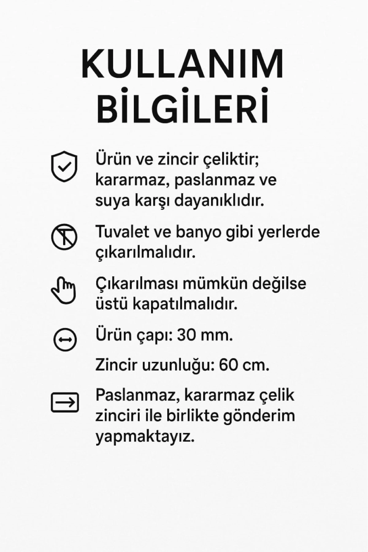 - Paslanmaz çelik materyali sayesinde uzun ömürlü ve dayanıklı bir aksesuar deneyimi sunar.