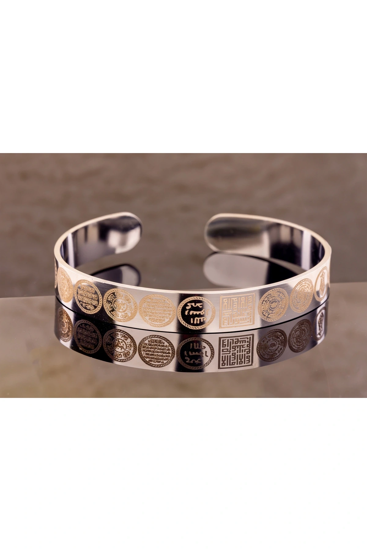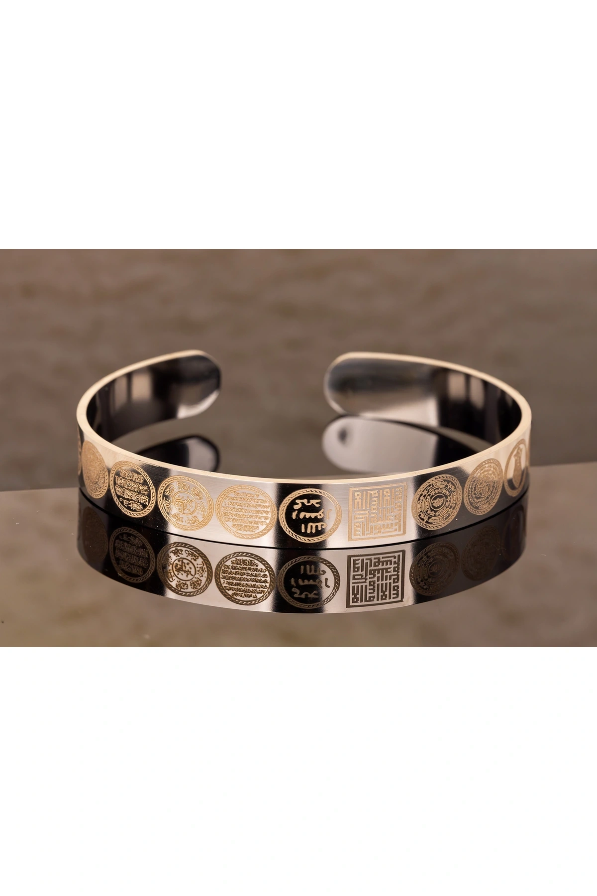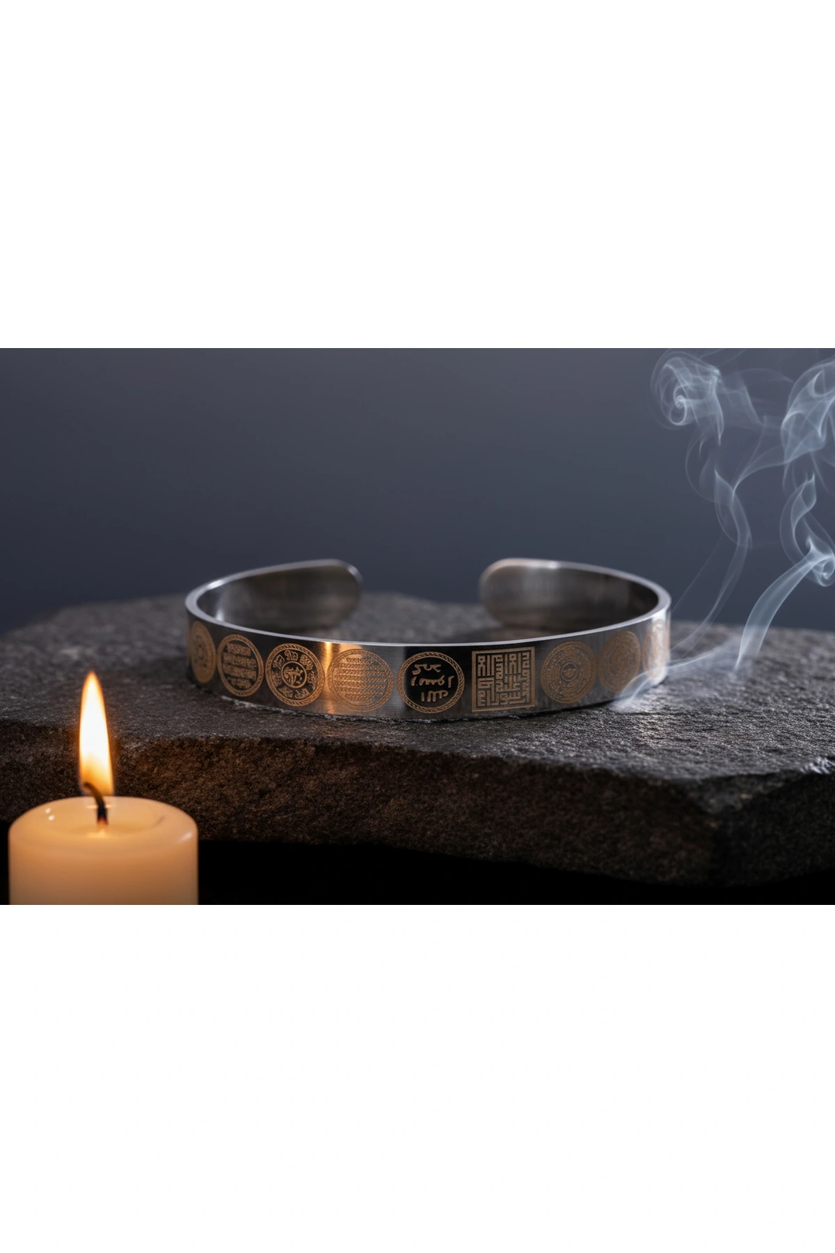 Titanyum kaplama çelikten üretilmiş bu özel dualı bileklik; paslanmaz, kararmaz ve uzun ömürlü yapısıyla günlük kullanıma uygundur. Üzerinde; Mührü Süleyman, Nal-ı Şerif, Kufi Allah Mührü, Celcelutiye, Hilye-i Şerif, Ayetel Kürsi, Ashab-ı Kehf, Nas ve Felak Suresi, Nazar Duası, Hakkani Mührü gibi birçok manevi sembol ve dua bulunur.
