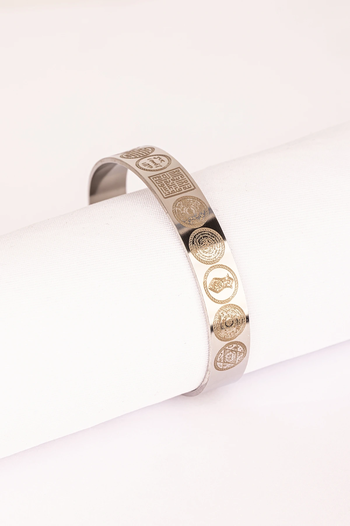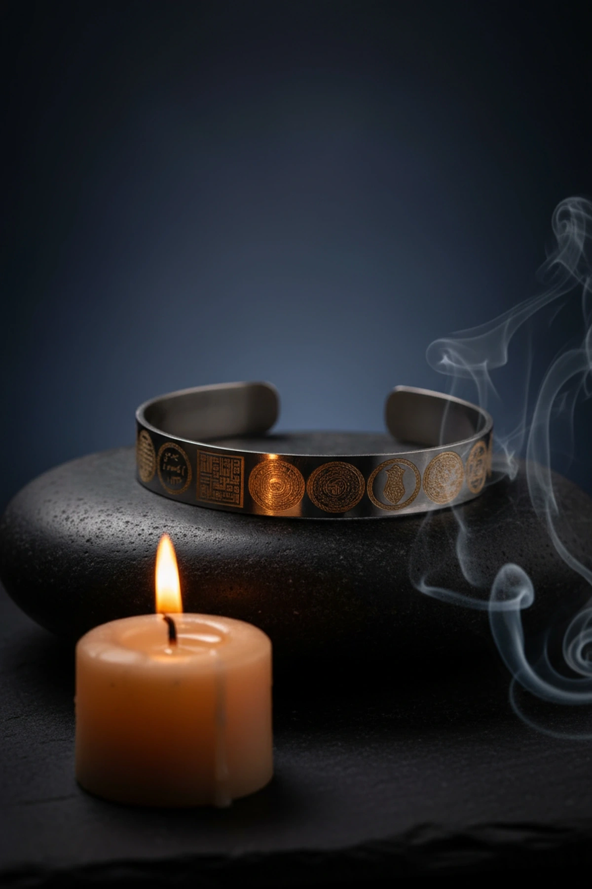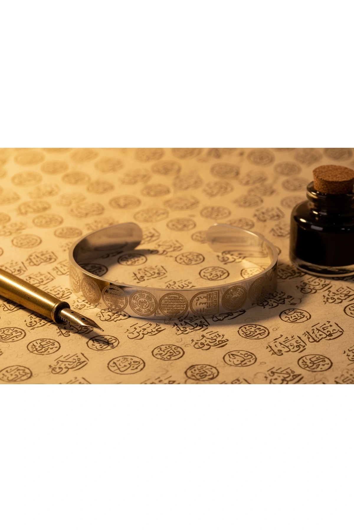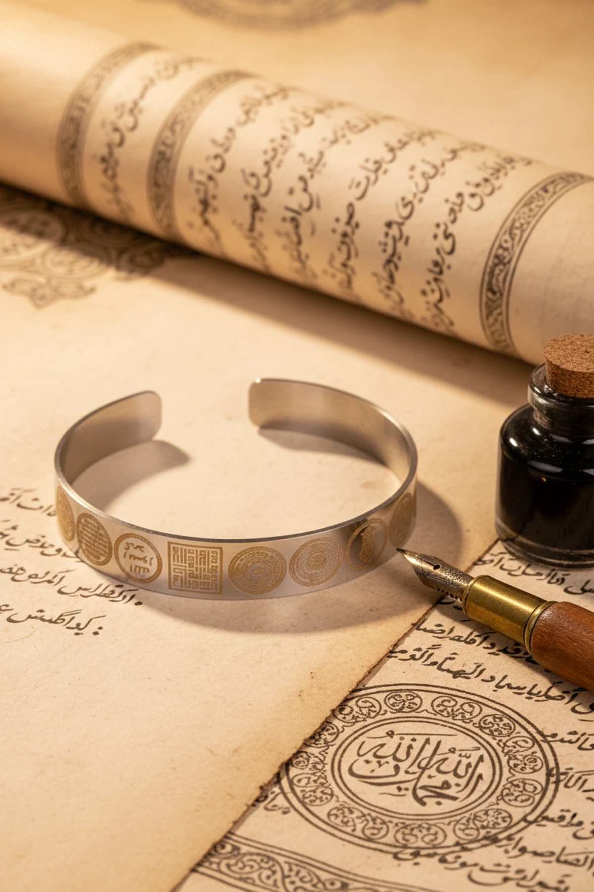 Titanyum kaplama çelikten üretilmiş bu özel dualı bileklik; paslanmaz, kararmaz ve uzun ömürlü yapısıyla günlük kullanıma uygundur. Üzerinde; Mührü Süleyman, Nal-ı Şerif, Kufi Allah Mührü, Celcelutiye, Hilye-i Şerif, Ayetel Kürsi, Ashab-ı Kehf, Nas ve Felak Suresi, Nazar Duası, Hakkani Mührü gibi birçok manevi sembol ve dua bulunur.
