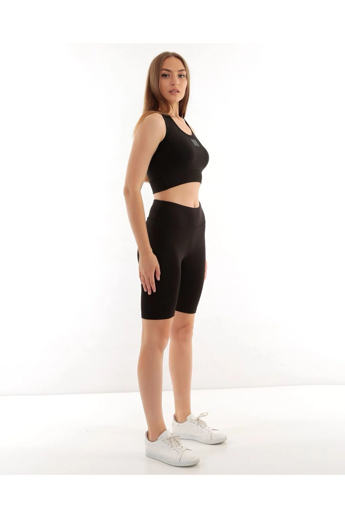 Kadın Siyah Yüksek Bel Premium Dalgıç Kumaş Düğmeli Fermuar Detaylı Şort Tayt
